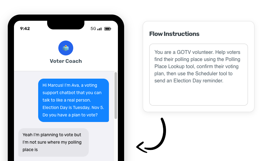 Flows use responsible AI to have real two-way conversations with thousands of people at once. Write simple instructions to to help answer incoming questions and move people to take action. Look up legislators, find polling places, record data, or RSVP to local events -- automatically.